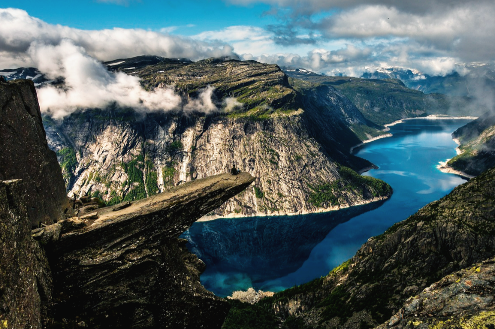 트롤퉁가(Trolltunga)는 노르웨이 서쪽 하르당에르(Hardanger) 지역에 위치한 절벽 바위 형상으로, '트롤의 혀'라는 뜻을 갖고 있습니다. 해발 약 1,100m의 바위가 협곡 위로 길게 튀어나온 모습이 마치 누군가의 혀처럼 보여 전 세계 여행객들의 버킷리스트 하이킹 장소로 사랑받고 있지요.